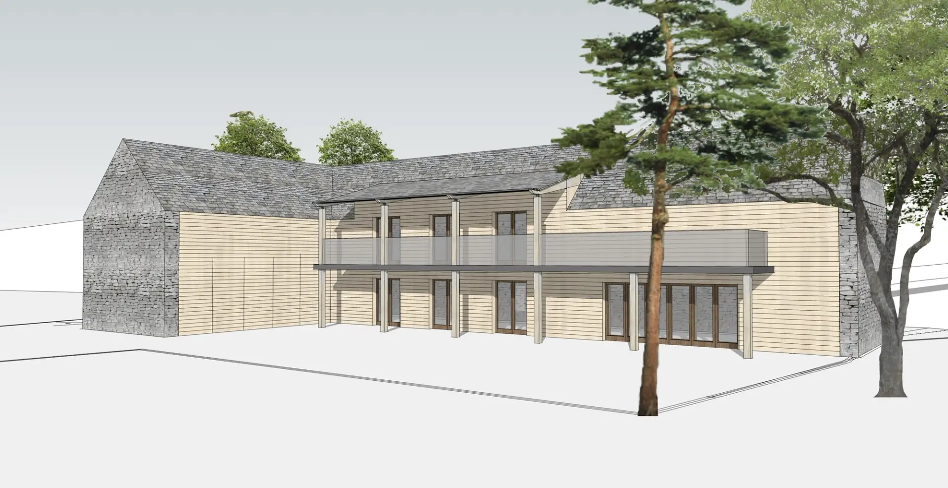 The existing stone walls will be retained as an external cladding to new insulated walls with walls to the rear cladded in timber to keep the converted barn aspect of the proposed design. The pitched roof will be reclaimed clay tiles to match the original. Timber structure to be apparent and in natural finish. Sustainability will be at the heart of the project, aiming to meet Passive House standards of design and generally creating a self-sufficient development. Heating by Ground-Source Heat Pumps and further energy generated by the PV cells on the southern elevation.