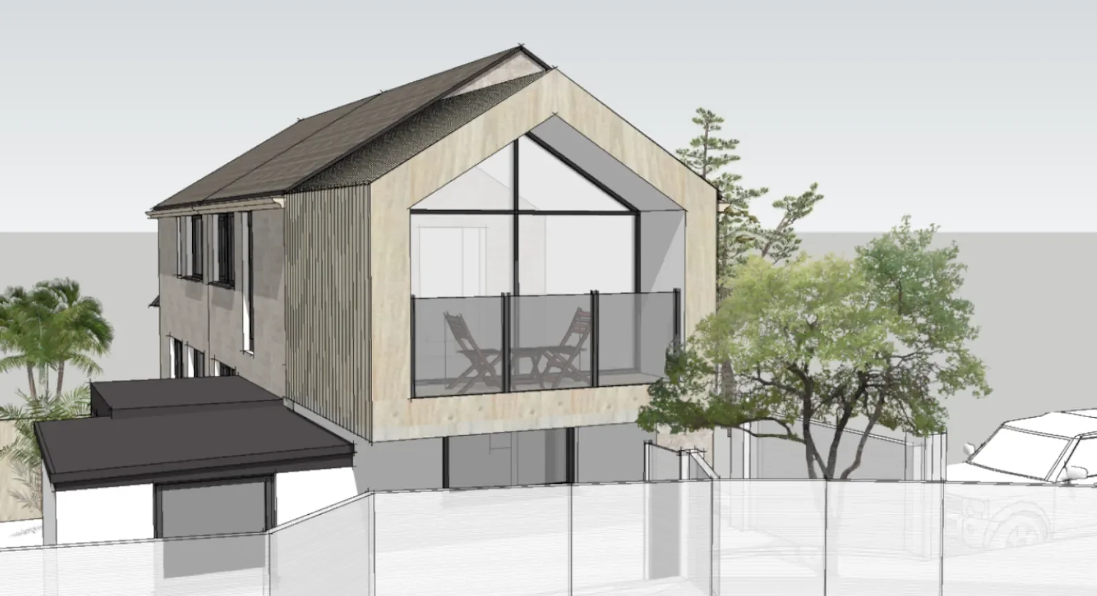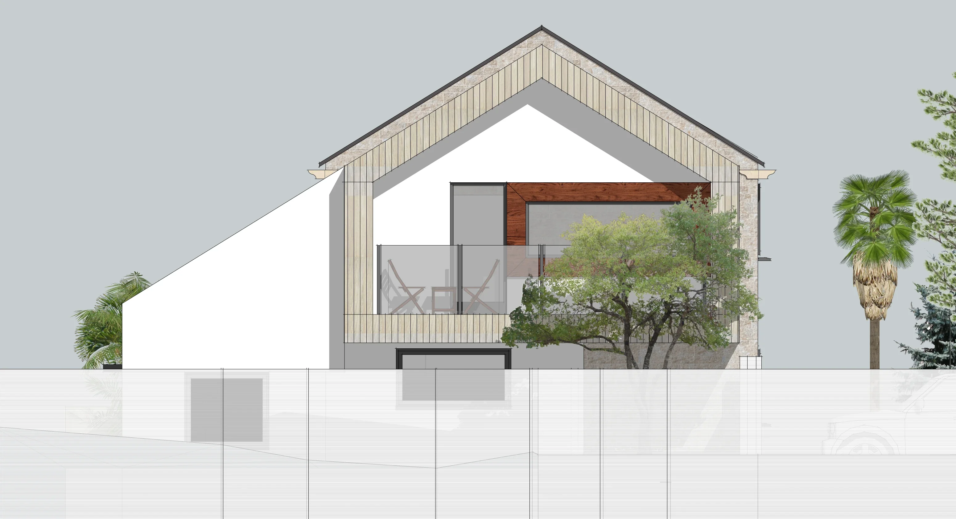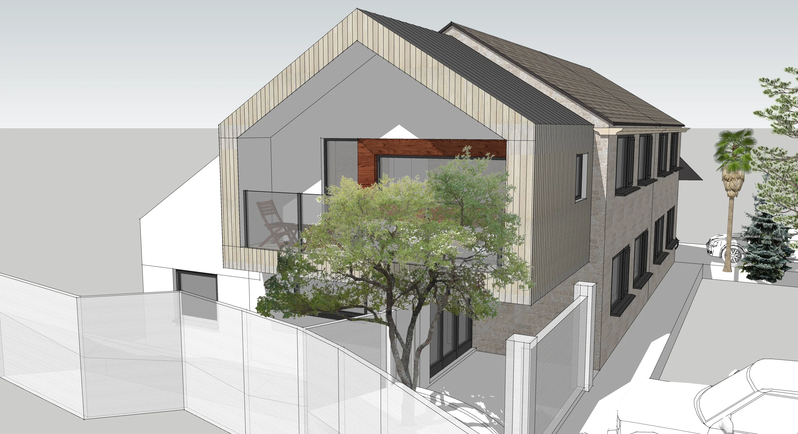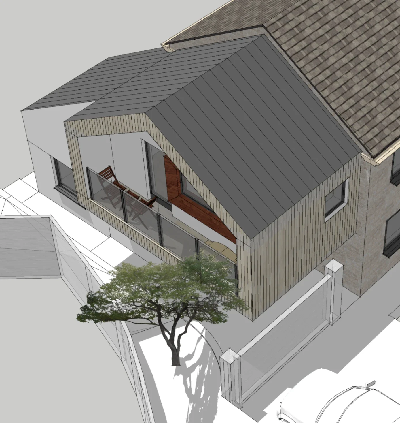 Following the same pitch as the existing roof, the extension will be however minor to the current side gable, by slightly lowering the ridge height. Large glazing with a small terrace/balcony to the front opening over the neighbouring fields in the Cotswolds AONB. The external walls will be finished in timber cladding and white render, working together yet in an elegant contrast to the existing buff Bath Stone cladding. The pitched roof will be dark grey zinc, treated typically for the Cotswolds, with no barge boards or fascias.
