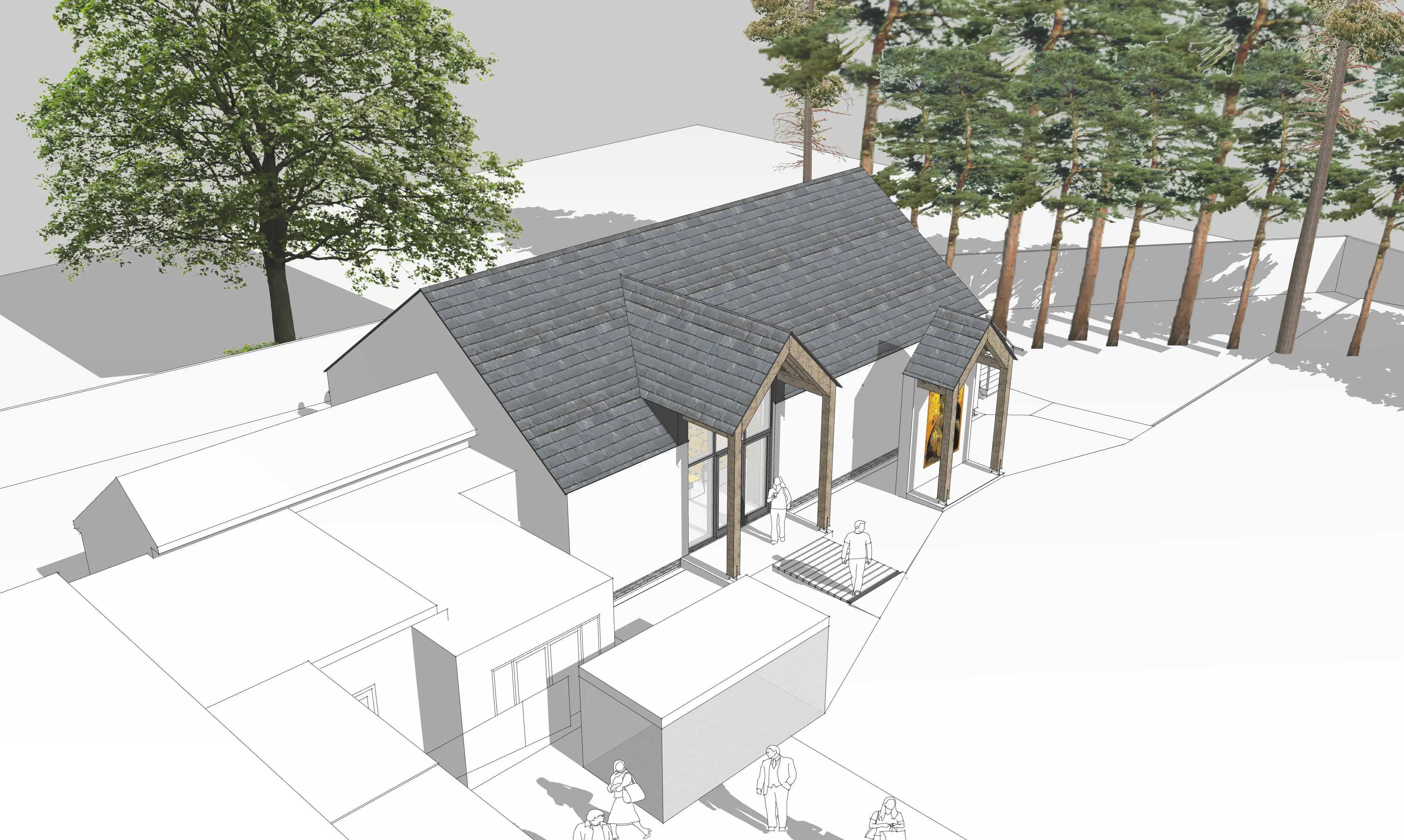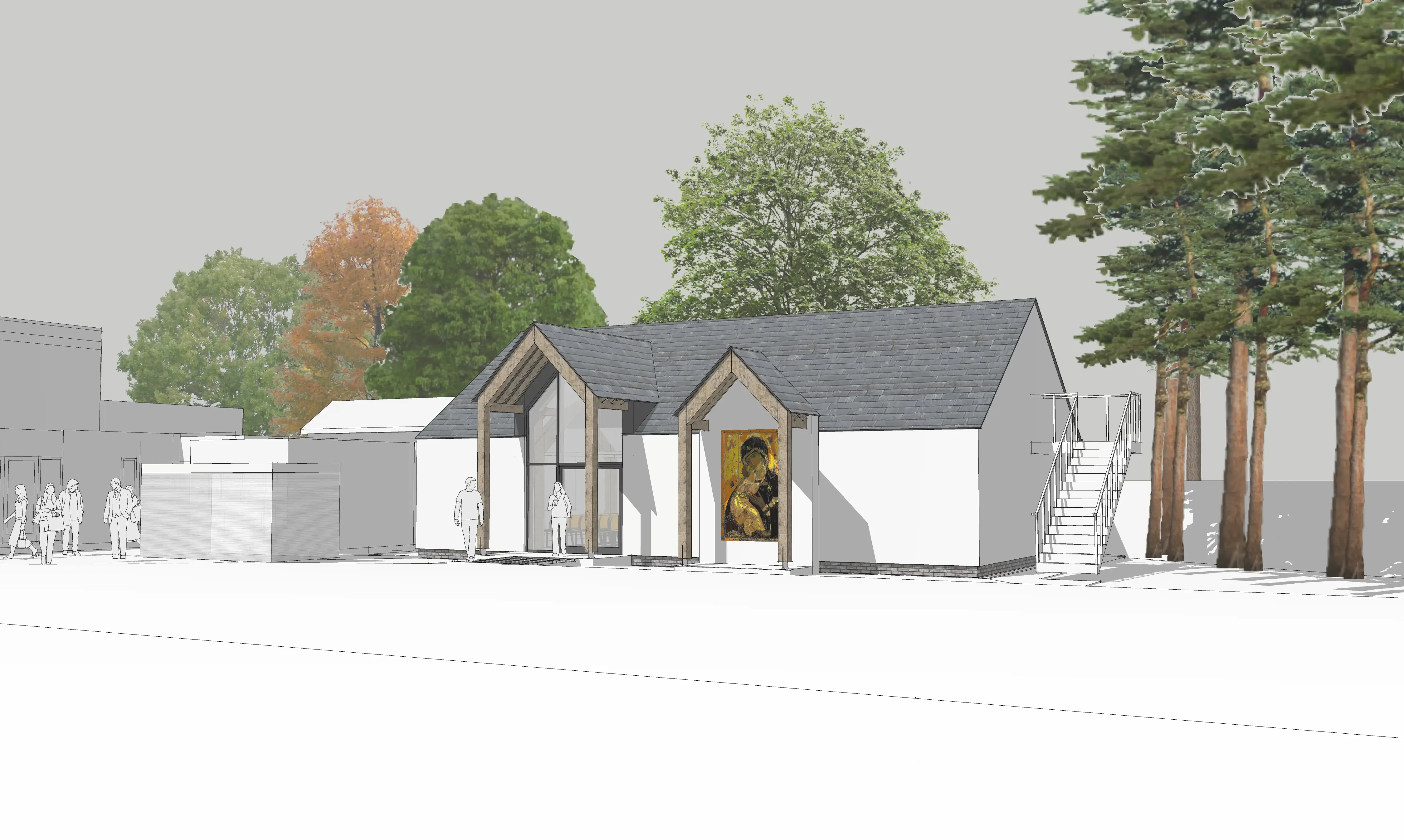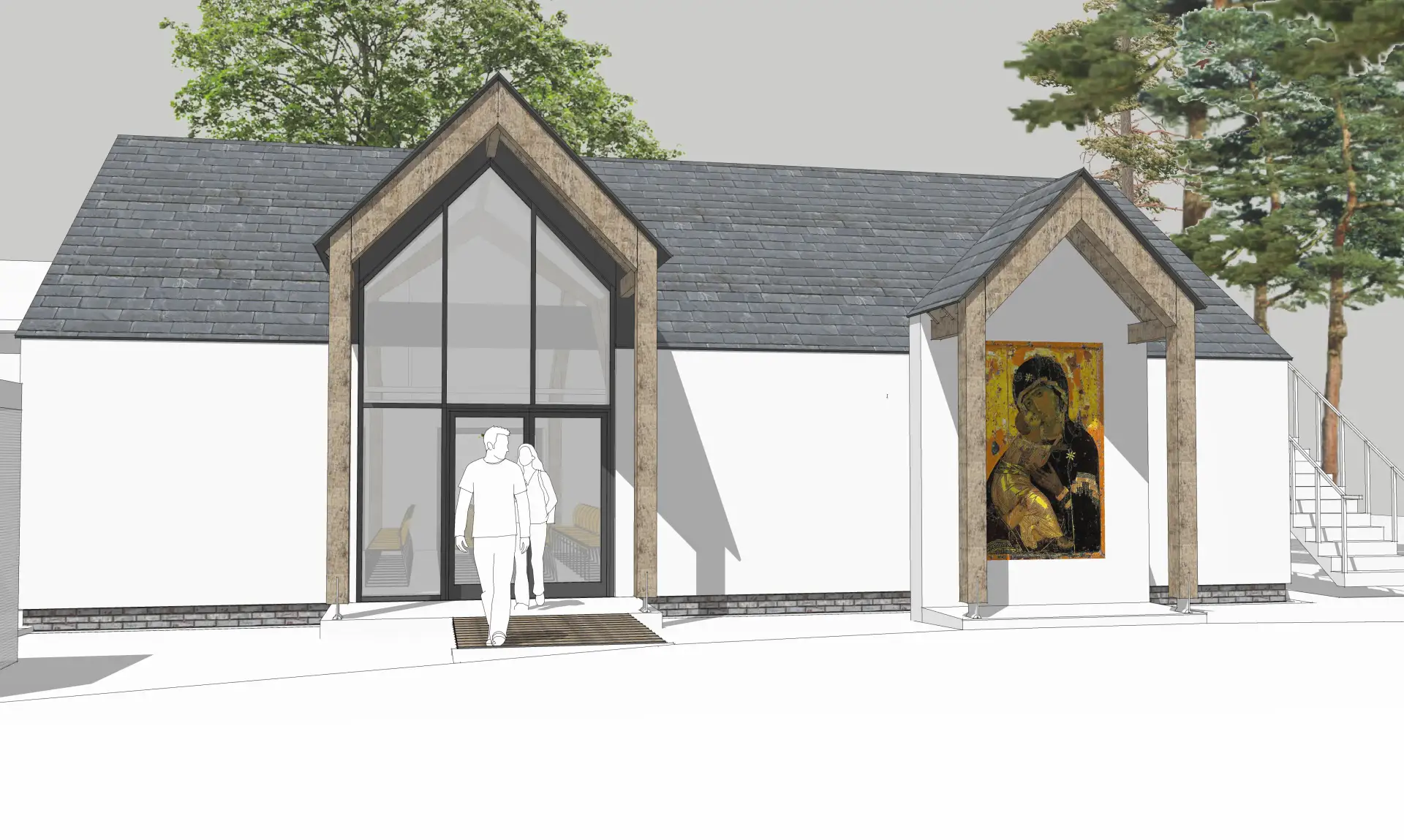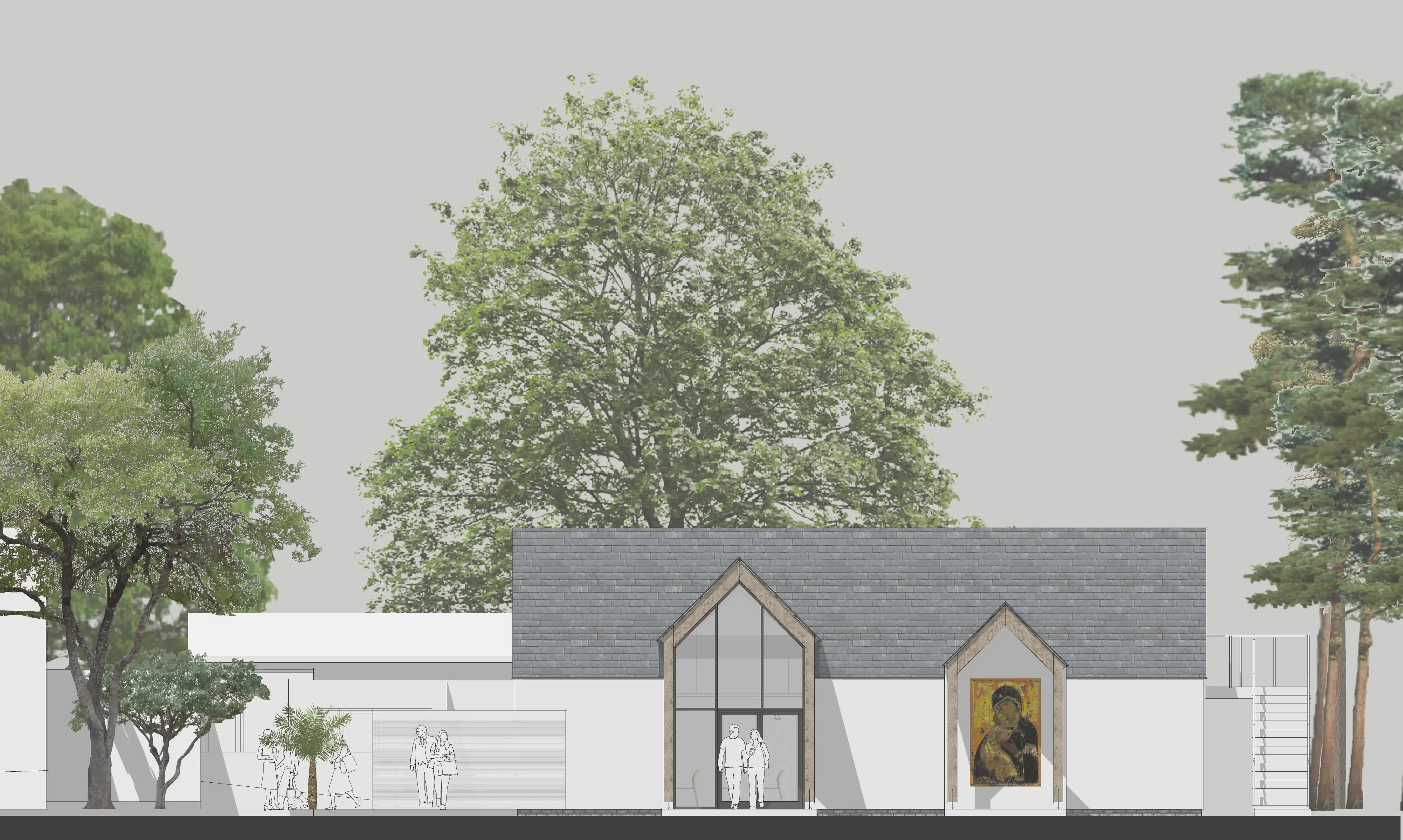 Existing bungalow will be entirely stripped, and converted into a mixed-use hall. A byzantine mosaic icon will sit next to the main entrance, serving as a signage for the entire complex and also used for worship. The existing bungalow will be thermally upgraded with rendered insulation applied to walls and new insulated cathedral roof. Sustainably sourced timber frame structure and PV cells to south-west elevation.